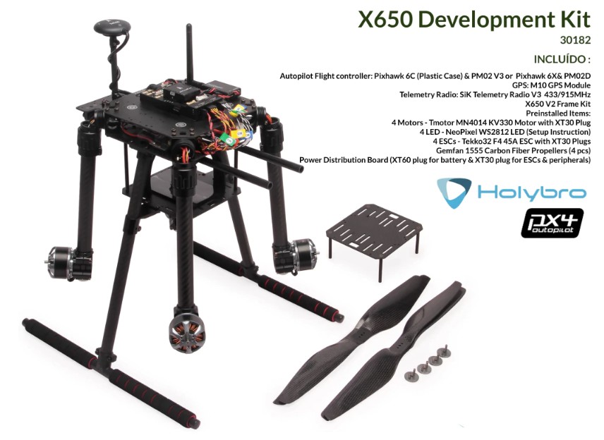 - Tempo de voo: 30 min (pairando com bateria 6S de 10000 mAh, sem carga útil adicional)