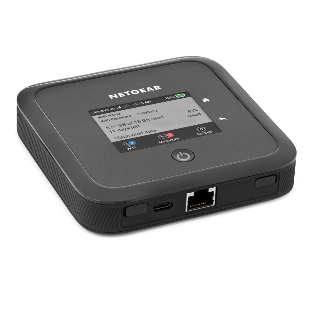 O roteador móvel Nighthawk M5 suporta planos de internet móvel 5G NR, 4G LTE e 3G fornecidos por serviços como AT&T e T-Mobile.